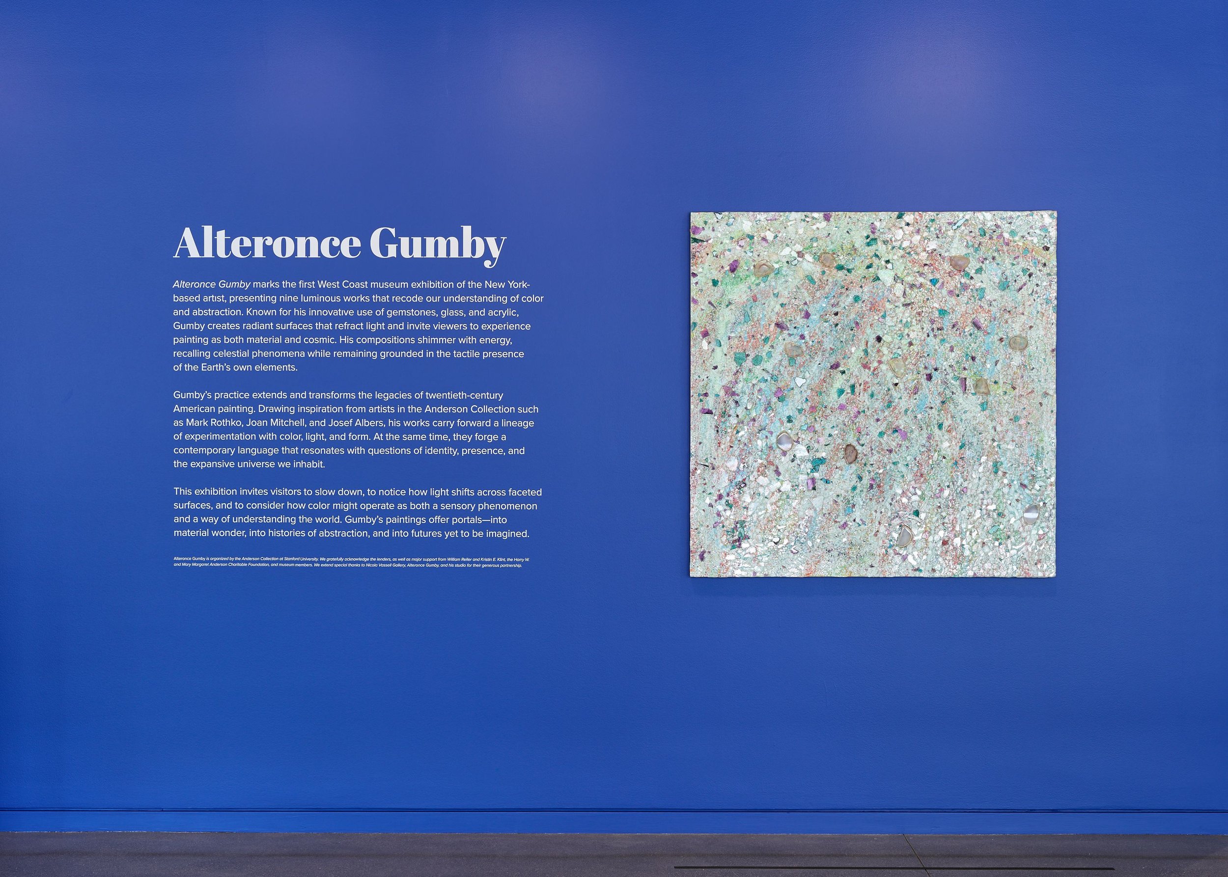 The Anderson Collection presents the first West Coast museum exhibition of New York–based artist Alteronce Gumby. Featuring nine recent works, the show celebrates Gumby’s ongoing investigation of color, the cosmos, and abstraction. Drawing inspiration from artists represented in the Anderson Collection, such as Mark Rothko and Joan Mitchell, Gumby’s luminous, textured surfaces extend the legacies of 20th-century American painting while forging a distinctly contemporary path. The exhibition will be on view in the Wisch Family Gallery from September 24, 2025-March 1, 2026.